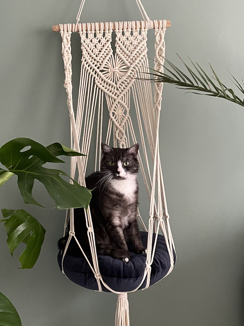 Everyone would like to have their own cozy place - Cat too! Woven out of love for cats, their individuality and characters. Can be hung in the window frame, thanks to which the cat will be able to comfortably observe the world and we can enjoy the eye with a beautiful decoration.